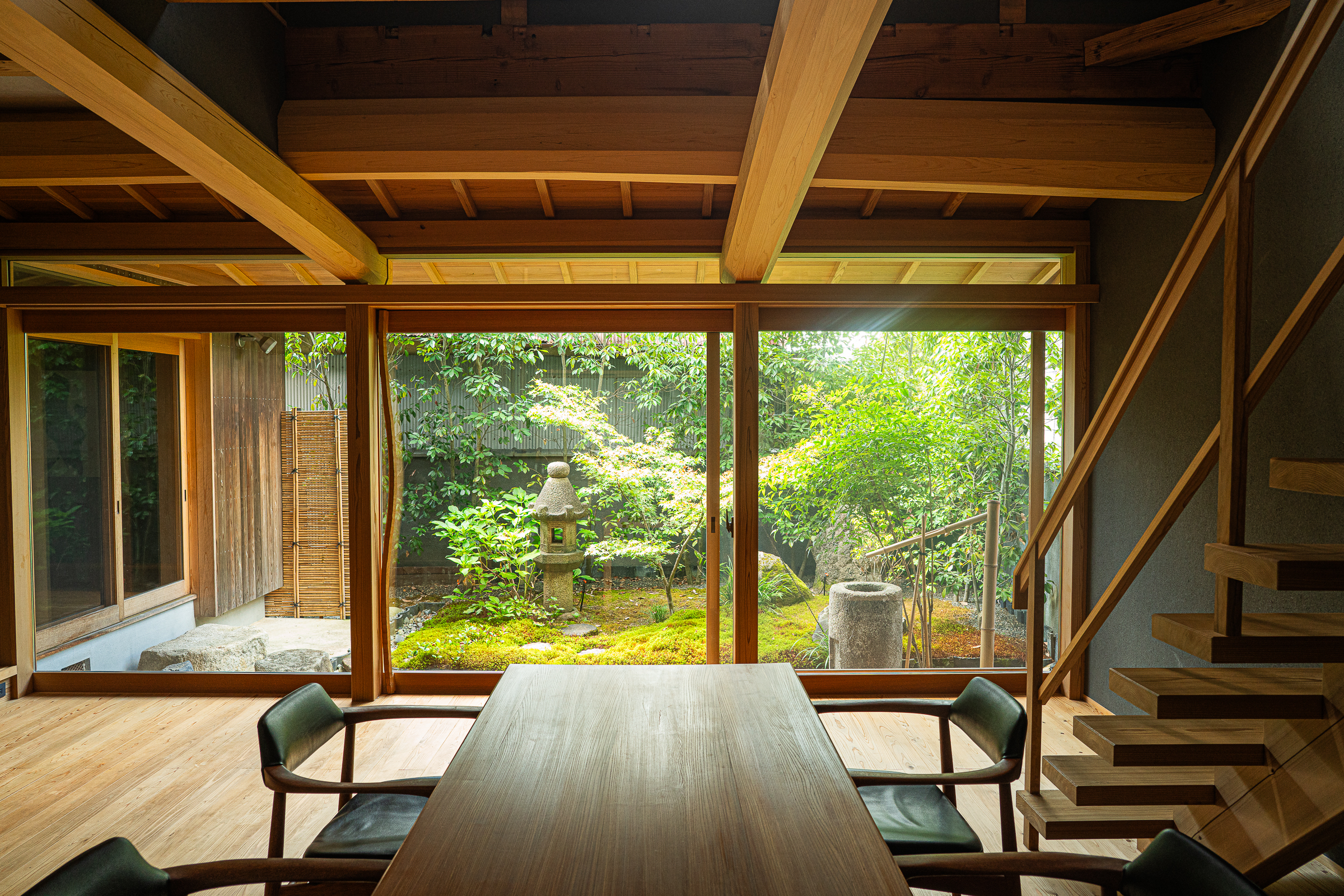 Stepping through the lattice-fronted entrance, you’re greeted by the gentle aroma of natural wood and the tactile charm of the naguri finish on the threshold. The house’s design celebrates nature, with materials such as wood, earth, and stone creating a harmonious, breathable space. Floor-to-ceiling glass doors flood the interior with natural light and open to a moss garden that becomes a magical display when illuminated at night. On the rooftop terrace, enjoy star-filled skies after a soothing bath or savor a morning coffee in the crisp air.