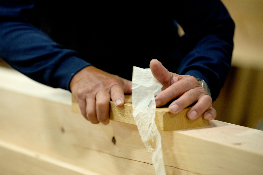 Yamamori refers to local forest rangers who, across generations, have cultivated and nurtured each cedar and cypress tree, passing their parents’ technical prowess and spiritual values onto their children. Before cutting down trees that have been carefully cared for by their ancestors, the yamamori pay their respects to the mountain’s deities, a gesture beautifully reflected in the wood after it has been worked into lumber. This lumber is transformed into a part of people’s lives through the expertise of traditional car penters who construct houses without using nails or metal fittings and skilled woodworkers who craft beautiful vessels from a single piece of wood.